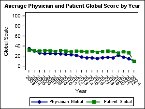 Just like the patient global assessment, the physician global assessment is a way of measuring the overall way RA affects a patient at a point in time. It generally includes a statement such as “What is your assessment of the patient’s current disease activity?” The best (lowest score) of 0 is labeled “No Arthritis Activity” and the worst (highest score) of 10 is labeled “Severe Arthritis Activity” with increments of 1 in-between. In the graph above, it has been transformed to be on a 0 to 100 scale to match the patient global assessment.